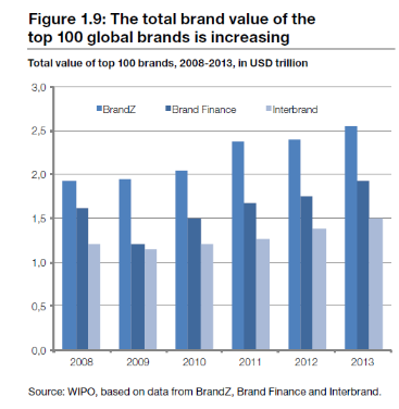 Il grafico in basso, tratto sempre dal “World Intellectual Property Report” del 2013 pubblicato dalla WIPO, mostra come negli ultimi cinque anni il valore, in miliardi di dollari, dei 100 top brands del mondo sia in continuo aumento. Si può notare come le tre agenzie citate nel grafico, anche in questo caso, forniscano valori sensibilmente diversi tra di loro.